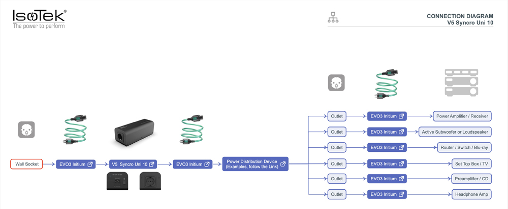 Der V5 Syncro Uni 10 kann entweder eigenständig für eine einzelne Komponente verwendet werden oder in Kombination mit einem anderen IsoTek-Stromreiniger als Upgrade, um eine vollständig neu ausbalancierte Sinuswelle über alle Ausgangsbuchsen bereitzustellen und GLEICHSTROM ZU ELIMINIEREN.